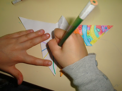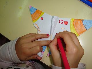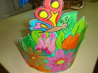 Por fim, regressámos à sala e aí reparámos que a "Primavera" nos tinha deixado um presente... Resolvemos abrir a caixinha e de lá saíram imensas borboletas com uma cabecinha feita com uma guloseima. Oferecemos uma a cada um dos nossos amiguinhos... (Hoje foi um dia especial, por isso pudemos excecionalmente saborear uma guloseima.)