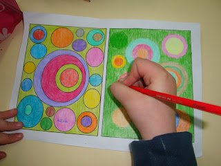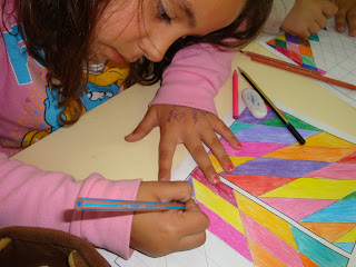 Para aplicar todas essas noções, uns usaram réguas e lápis de carvão e outros utilizaram compassos... Dessa forma, pusemos "mãos à obra" e a nossa criatividade permitiu-nos elaborar desenhos abstratos / geométricos... Depois pintámos com lápis de cores variadas e construimos "quadros" que expusemos num painel da nossa sala de aula.