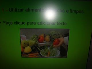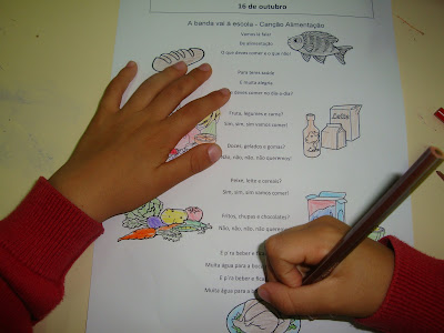 Hoje, convidámos as outras turmas da escola a virem à nossa sala de aula e nós apresentámos a história «O pato que não comia hortaliças», explorámos um PowerPoint informativo, entoámos a canção: «Alimentação», pintámos a "Roda dos Alimentos" e elaborámos quadras sobre os frutos.