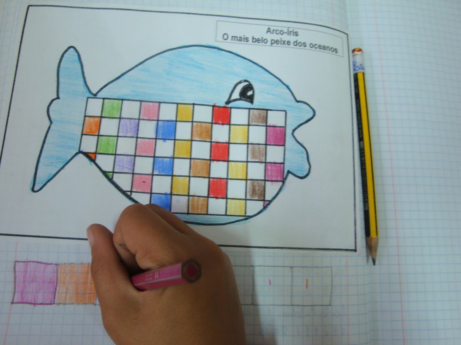 Numa aula, já estivemos a construir o peixinho Arco-íris, orientados pela professora Susana e com a colaboração da nossa professora. Para isso, contornámos o molde de um peixe, recortámos e fizemos tecelagem, utilizando fitas coloridas. Estivemos a explorar noções matemáticas e muito mais... Assim, aprender torna-se divertido!...