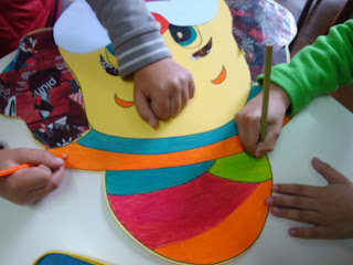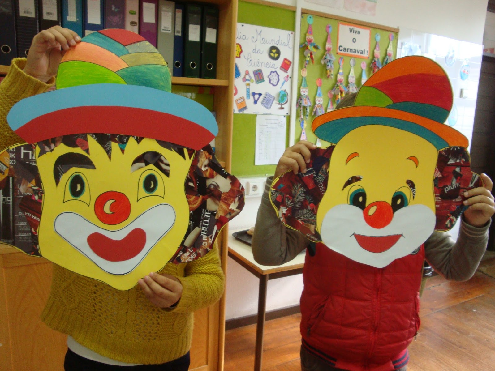 Na nossa sala de aula já se sente a folia do Carnaval... Por isso mesmo, todos nós estivemos a fazer uma espécie de magia, pois transformámos simples folhas de papel em palhaços bem coloridos e engraçados!... Pintámos, recortámos, enrolámos e montámos um belo painel carnavalesco... Depois, imaginámos que cada palhaço ganhou vida, falando sobre as características do respetivo dono... Por exemplo: o palhaço do Guilherme afirmou que era tão divertido como o seu dono; o palhaço da Inês mostrou-se muito feliz por ter a sorte da sua dona ser bem comportada e ter tão bom gosto... Nós continuamos ansiosos para saber mais do que "pensarão" os nossos palhaços sobre nós... Trata-se de um jogo engraçado que põe a nossa criatividade à prova...