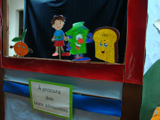 Hoje, nós apresentámos o teatro de fantoches: «À procura de bons alimentos», às restantes turmas da escola. Desta forma, partilhámos, com os nossos colegas, conhecimentos que nos ajudam a ter uma alimentação variada e equilibrada.