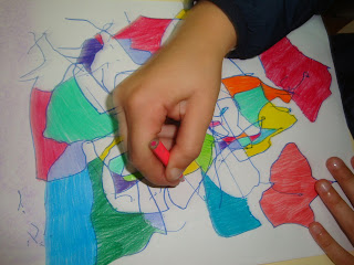 Hoje, a nossa professora pegou nesses desenhos e motivou-nos a observá-los atentamente e lembrou-nos que há pintores muito famosos que fazem pinturas abstratas. Por isso mesmo, poderíamos utilizar os desenhos feitos com os pés e transformá-los em “quadros” (agora utilizando as mãos para os pintar), representando figuras que existem na realidade ou “brincar” com as cores e fazer um trabalho colorido e cheio de alegria…